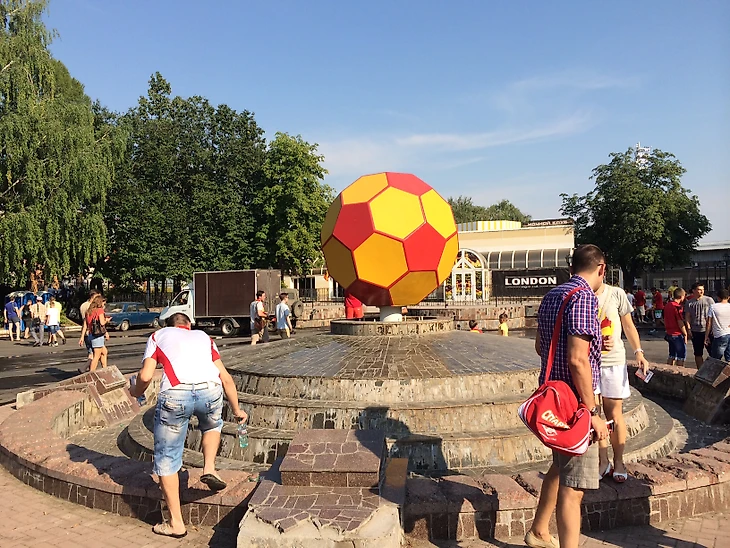 Центральное место встреч на стадионе «Арсенал» – красно-желтый мяч, который издали напоминает аккуратный парковый фонтан.
