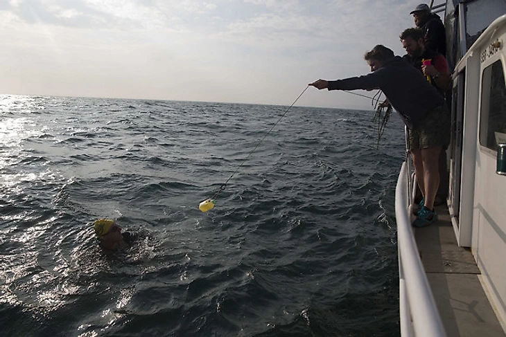 Пол изучает плавательную часть маршрута, которую только что преодолел.