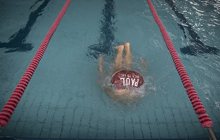 Тренировался Пол не только в открытой воде, но и в бассейне. Это уже июльские кадры.