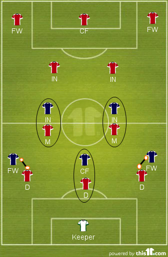 # 2 полузащитника играют против двух полусредних нападающих («инсайдов»). Большую часть времени помогают обороне.