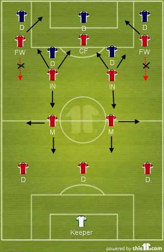 # Ближайшие к воротам противника — два крайних и средний нападающих. Задачи крайних: на скорости пройти флангом и дать пас среднему, который играет в штрафной площадке. Оборонительных функций практически не имели: