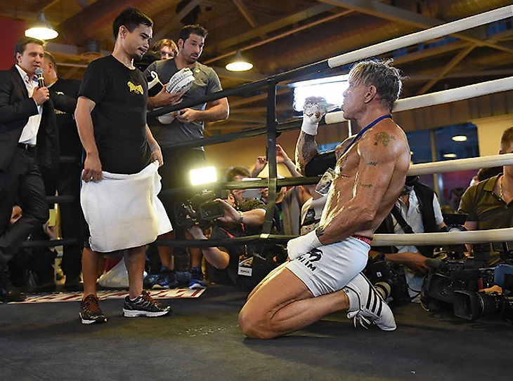 Один из самых известных голливудских актеров  Микки Рурк в ближайшую пятницу проведет свой первый после многолетнего перерыва официальный боксерский поединок. На ринге в Москве 61-летний Рурк встретится с 29-летним американцем Эллиотом Сеймуром.