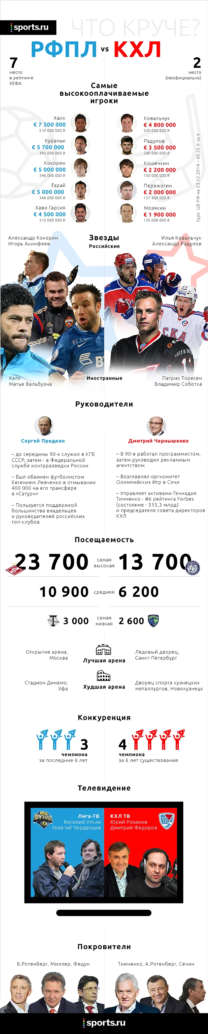 Инфографика Sports.ru сравнивает две главные лиги в российском спорте.