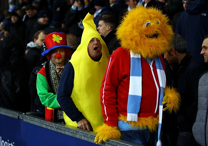 А это фаны «Ман Сити». Некоторые костюмы, возможно, остались с Хэллоуина.
