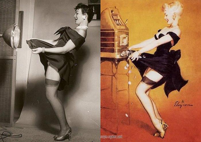 Так какая же она – красотка в стиле Pin-Up? Девушки охотно кокетничали, улыбались и подмигивали, как бы невзначай обнажая «интересные» части своего тела. Собственно, в этом и заключается особенность Pin-up’а - создается впечатление, как будто все красотки застигнуты врасплох: то юбка все время за что-то цеплялась, то девушка обо что-то спотыкалась и падала вверх ногами, то бретелька предательски спадала с плеча. Вот почему у многих из них на лице так и читается - ooops!
