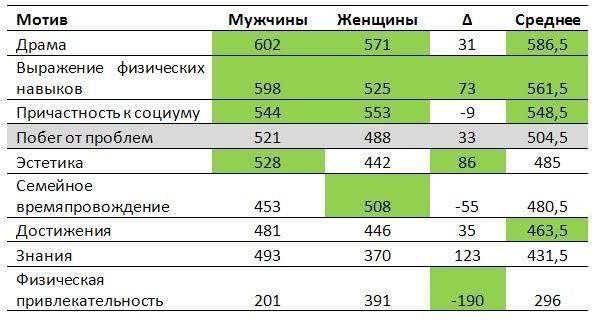 Результаты отображены в таблице ниже (чем больше, тем выше мотивация). К первоначальным данным (столбцы 1-3) было добавлено ещё 2 столбца: разница между мужским и женским восприятием, а так же среднее арифметическое.