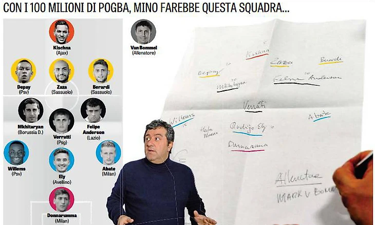 Рядом с ним – знаменитый футбольный антрепренер Мино Райола, требующий быть серьезнее в любой ситуации. Три года назад Райола получил отказ от «Ромы» и обоих миланских клубов («Интер» не хотел проявлять неуважение к Фергюсону). Сегодня он комментирует интерес со стороны «ПСЖ» и «Реала» и между делом собирает целую команду на деньги, которые можно выручить от продажи Погба.
