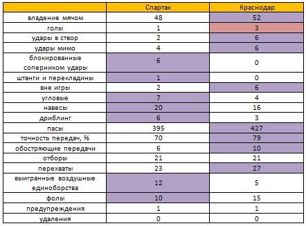Московский «Спартак» при своих болельщиках, а их пришло 28039 человек (67% от вместимости арены), довольно безобразно и безвольно уступил «Краснодару». Команда Кононова показала симпатичный футбол и доказала, что готова вести борьбу за лигочемпионские места. Взглянем на статистику и определим главных героев прошедшего поединка.
