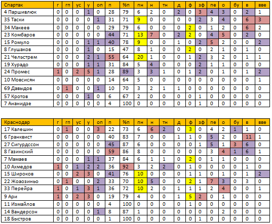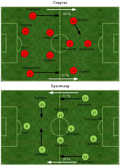 Одной из главных причин столь невыразительной игры «Спартака», стали провальные действия игроков центра поля. Москвичи преимущественно атаковали флангами: 45% атак через левую бровку и 35% через правую. В середине же зияла огромная дыра. Опорные полузащитники «красно-белых» с завидным постоянством дари мяч сопернику. У Глушакова из 15 передач 8 оказались неточными (47% точность), уЧельстрема из 55 пасов 20 не дошли до адресата, только Ромуло может быть более-менее доволен, у него 78% точных передач. Естественно, с такой точностью ни о какой комбинационной игре не может быть и речи. Хозяева сбивались на фланги в надежде на навесы и индивидуальные действия отдельных игроков. Многое зависело от единственного форварда Мовсисяна, но, к сожалению, Юра вышел на поле, скорее в роли предмета мебели, нежели как боевая единица. В общем, в «Спартаке» провалилась вся центральная ось, начиная с форварда и полузащитников и заканчивая защитниками. Таски и Макеев несколько раз оставались в роли сторонних наблюдателей, когда расстреливали их вратаря. Еще одним показателем, характеризующим безобразную игру в обороне, являются заблокированные удары. Хозяева ни разу за весь матч не сумели заблокировать выстрелы соперников, у «Краснодара» для сравнения только Сигурдссон трижды вставал на пути мяча, а всего же оборонцы обезвредили 6 выстрелов.