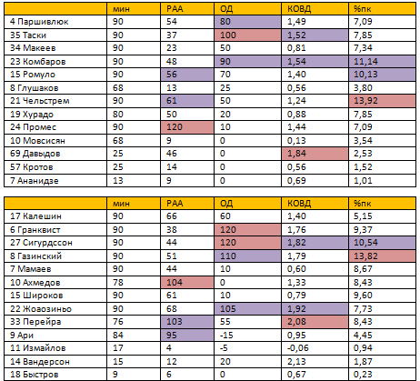 Рейтинг атакующей активности (РАА): гол – 50, голевая передача (заработанный пенальти, забитый пенальти) – 25, точная передача– 1, удар в створ – 10, удар мимо– 5, обостряющая передача – 5, удачный дриблинг– 5, заработанный штрафной – 5, навесы: точные – 3, неточный – 1. Рейтинг оборонительных действий (ОД): перехват - 10, отбор – 10 и блокированный удар – 10, выносы мяча из своей штрафной - 5, фолы – (-5). Коэффициент объема выполненных действий (КОВД) определяется по формуле (РАА+ОД)/мин, то есть он равен сумме выполненных действий футболиста деленной на проведенные минуты. %пк – процент передач игрока.