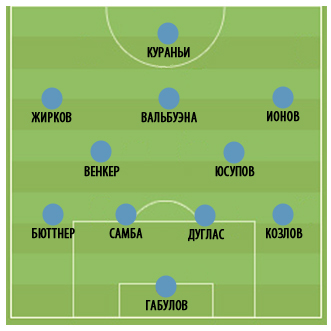 Запасные: 1. Шунин, 21. Березовский, 15. Губочан, 28. Ротенберг, 81. Данилкин, 77. Катрич, 88. Ташаев.