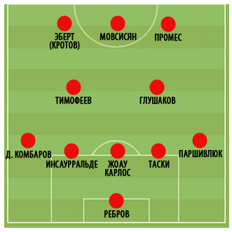 "Спартак" (Москва): 32. Ребров (к) – 4. Паршивлюк, 55. Жоау Карлос, 2. Инсаурральде, 35. Таски, 23. Комбаров – 24. Промес, 8. Глушаков, 7. Ананидзе (40. Тимофеев, 72), 20. Эберт (57. Кротов, 84) – 69. Давыдов (10. Мовсисян, 63).