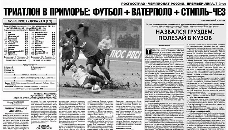 – В полдень того же дня было обнародовано, что матч «Арсенал» – ЦСКА не состоится в Туле, потому что в Туле газон не сильно лучше, чем в Раменском. Где будет проводиться матч, пока выясняется, но скорее всего – в Москве.