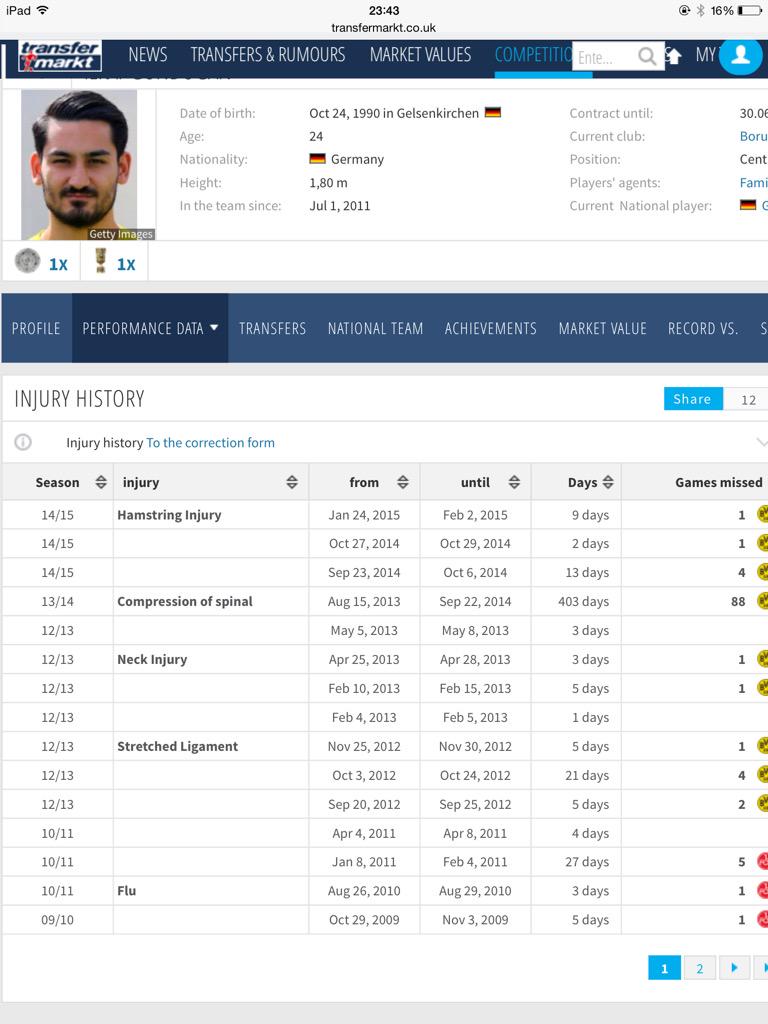 Вот здесь можно посмотреть все травмы Гюндогана