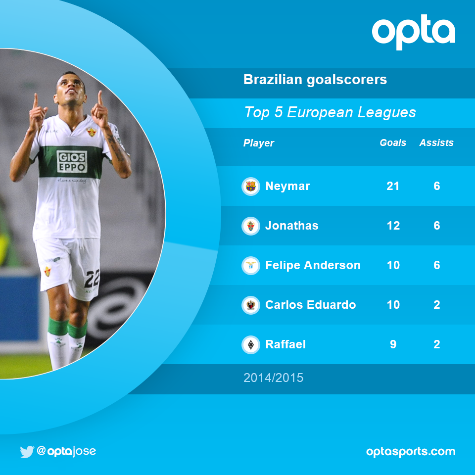 4 мая 2015, 09:08 1 мин. Неймар - лучший бомбардир среди бразильцев в топ-5 европейских чемпионатовEx-GeniusАвтор272 подписатьсяЕго ближайший преследователь - Жонатас - также выступает в ПримереФелипе АндерсонБарселонаКарлос Эдуардо АлвесЖонатасЛа ЛигаЭльчеНеймарРаффаэл