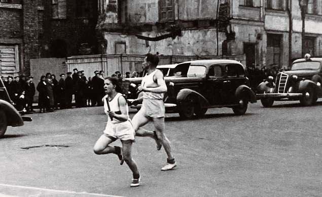 Комбинированная легкоатлетическая эстафета по Садовому кольцу, 16 этап. На снимке динамовские легкоатлеты Лидия Крючкова и Иван Соколов. Москва, 1943 г. Фото: предоставлено пресс-службой Общества «Динамо»