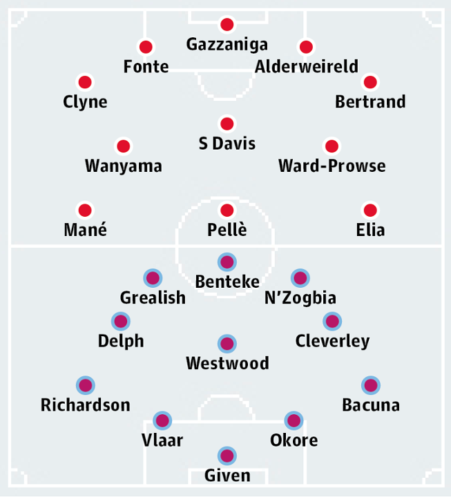Given, Bacuna, Vlaar, Okore, Hutton, Westwood, Delph, Cleverley, N’Zogbia, Grealish, Benteke