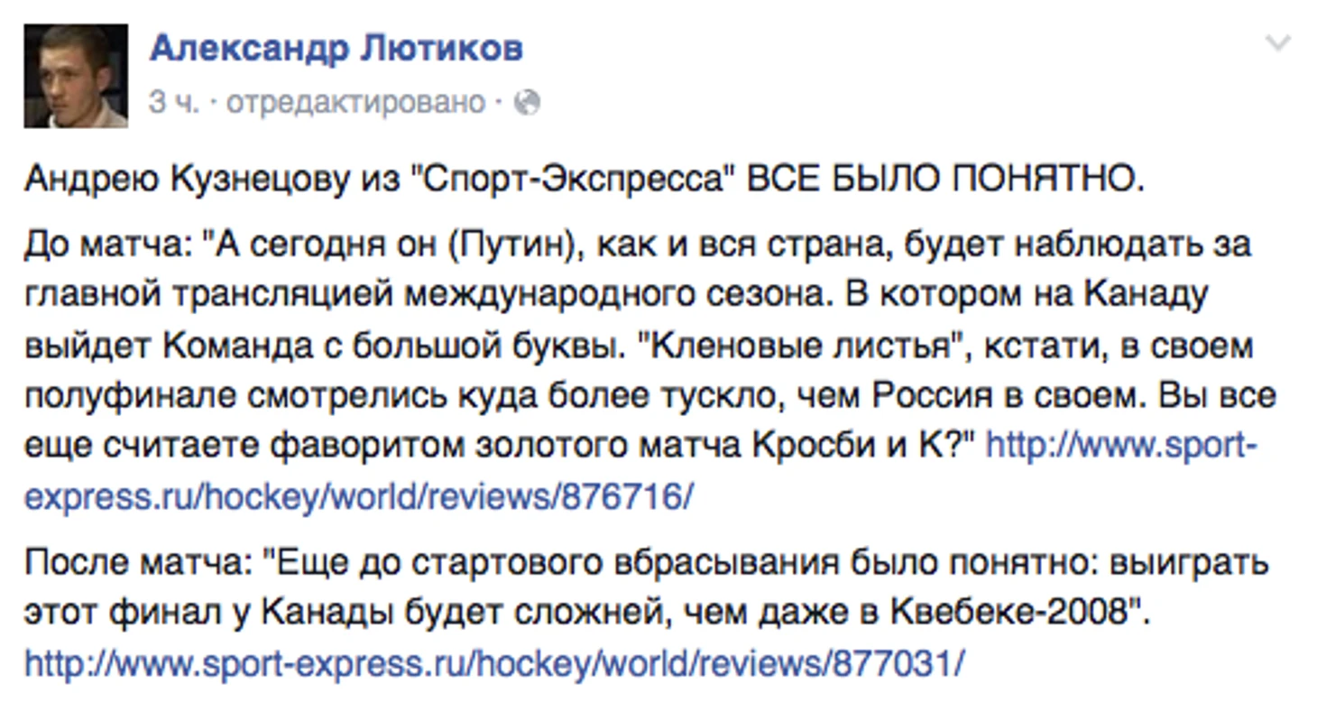 Вот, например, золотое перо «Спорт-Экспресса» Андрей Кузнецов рецензирует полуфинал против США у себя в фейсбуке: