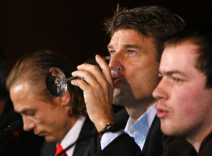 12 сентября 2008 года. Москва. Микаэль ЛАУДРУП (в центре) только что подписал контракт со "Спартаком". Слева - Валерий КАРПИН, справа - Роман АСХАБАДЗЕ. Фото - Алексей ИВАНОВ, "СЭ"