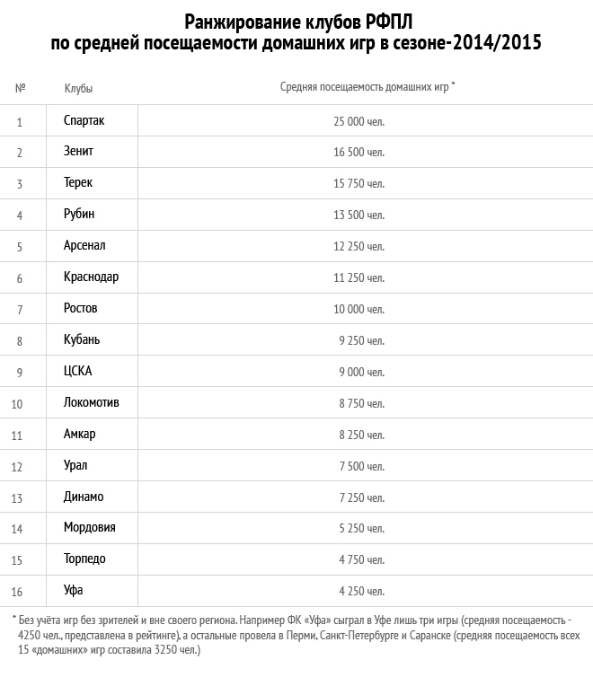 Рейтинг клубов по посещаемости домашних игр прошедшего первенства выглядит следующим образом.