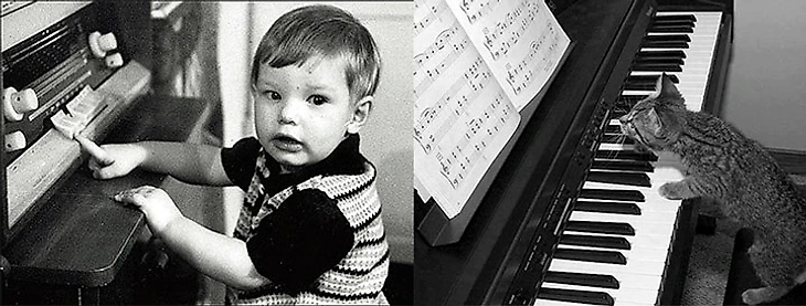 6. Андрей Аршавин играет на радио, а котик смотрит в ноты и играет на пианино.