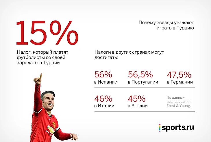 Ставка налога для футболистов существенно ниже, чем для обычных турков, получающих, допустим, 2200 лир в месяц (756 евро). Те отдают государству 27 процентов заработка.