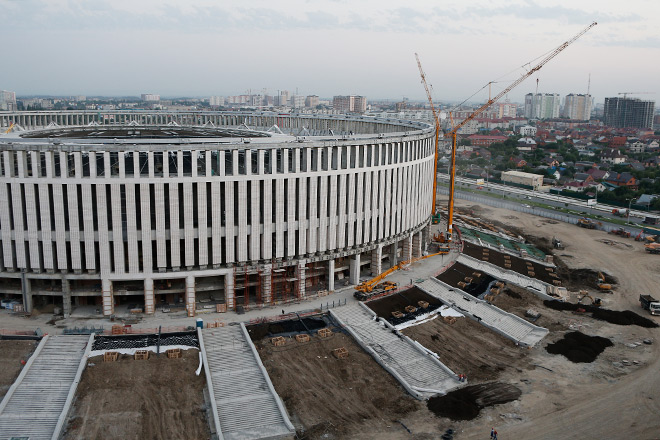Впрочем, при ближайшем рассмотрении будущий дом «Краснодара» кажется каким-то… обычным, что ли. Нет в нём чего-то такого, что цепляет и сохраняет его в памяти. Может быть, уже в достроенном состоянии он будет выглядеть намного ярче? На строительную площадку нас с фотографом Александром Мысякиным пускать отказались: посторонних быть не должно, а каждый шаг на стройке фиксируют камеры. Так что мы решили рассмотреть стадион «Краснодара» с балкона одного из жилых домов. Говорят, что арена откроет двери уже осенью этого года – однако с верхотуры кажется, что у строителей ещё непочатый край работы.