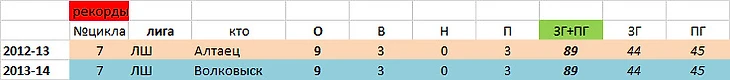В 7-м цикле 2012/13 в 6 играх Алтайца (А.-Факел 8-9, Оружейник-А. 6-10, А.-Вулкан 5-8, Вулкан-А. 6-7, Факел-А. 11-7, А.-Оружейник 7-5)
