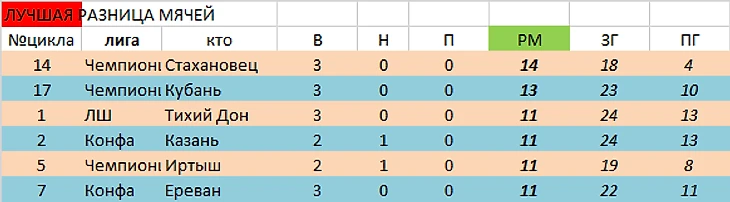 Лучшая выездная разница мячей +14 была у Стахановца в 14-м цикле