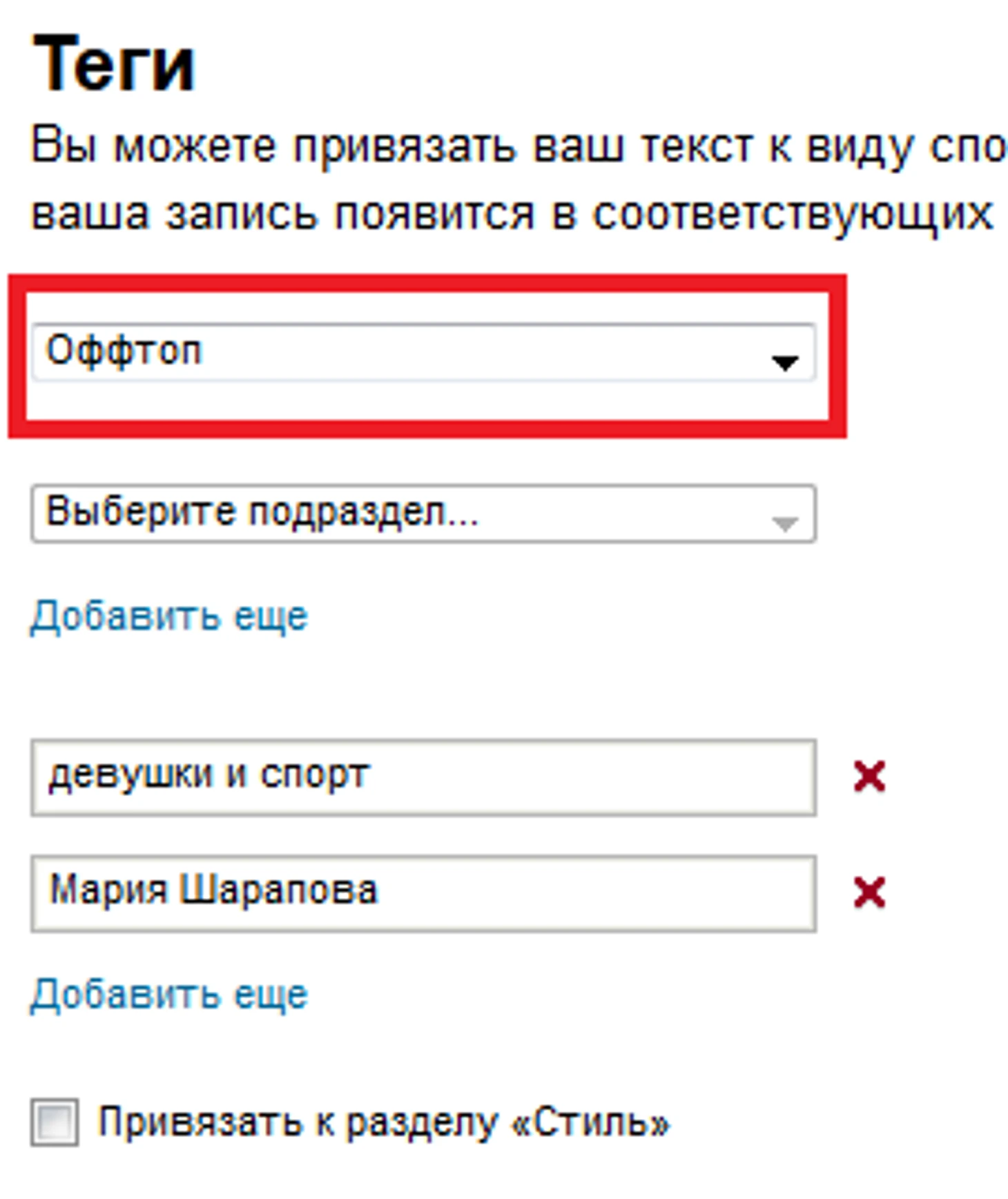 1. Ставим тег "девушки и спорт", он сам выпадет из окошка, когда вы начнете его там прописывать: