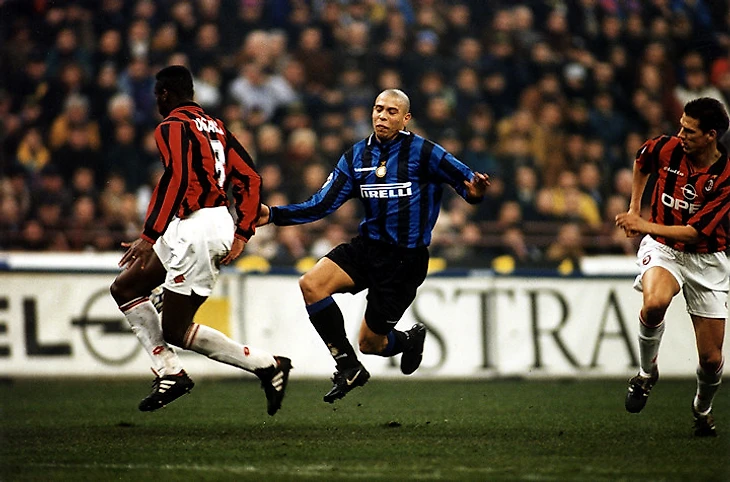 Ноябрь-1997. Форвард «Интера» Роналдо против Марселя Десайи (слева) и Кристиана Циге. В «Интере» появились Тарибо Уэст и Диего Симеоне, а за «Милан» тогда еще сыграли Патрик Клюйверт, Леонардо и легенда «МЮ» Массимо Таиби. Снова ничья – 2:2 (Симеоне, Роналдо – Веа, Круз).