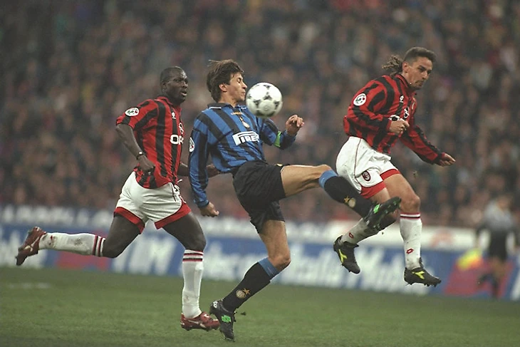 Ноябрь-1996. Защитник «Интера» Массимо Паганин против форвардов «Милана» Роберто Баджо и Джорджа Веа. За «Интер» в тот день еще играли Пальюка, Дзанетти, Инс, Саморано, Джоркаефф, за «Милан» – Мальдини, Барези, Бобан, Давидс. Игра закончилась вничью 1:1 (Баджо-Джоркаефф).
