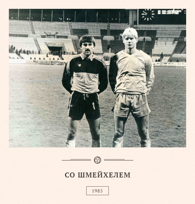 Москва. Стадион «Динамо». Отборочный матч VIII молодёжного чемпионата Европы. Сборная СССР против команды Дании. На фото я с Петером Шмейхелем — будущей легендой «МЮ» и сборной Дании. А тот матч мы, к слову, выиграли у датчан со счётом 2:0.
