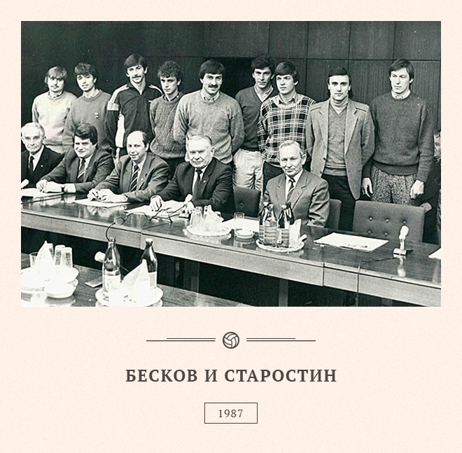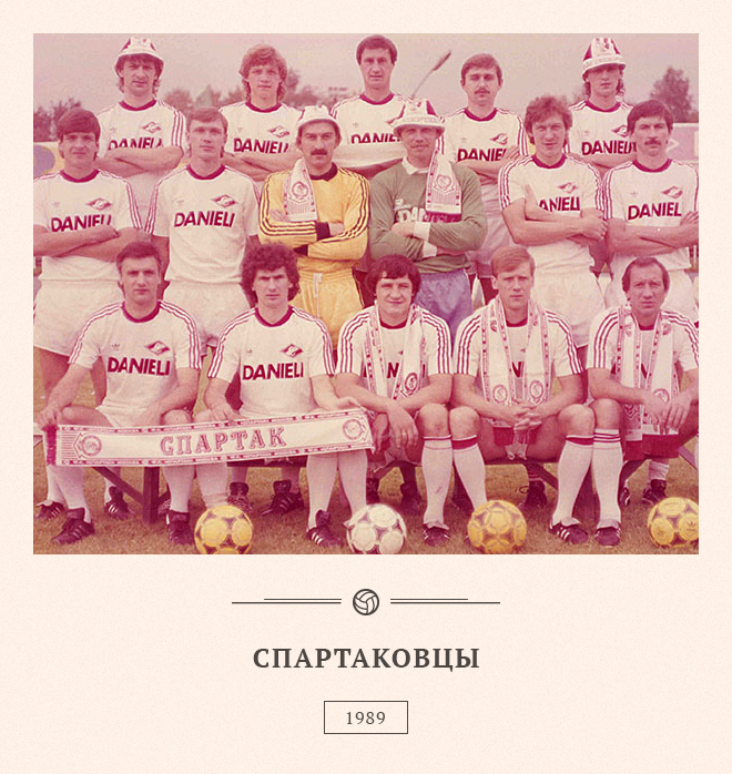 На фото слева направо: Черенков, Каюмов, Суслопаров, Шалимов, я, Дасаев, Новиков, Бокий, Кузнецов, Кужлев (верхний ряд). В нижнем ряду сидят два знаменитых спартаковца – главный тренер красно-белых Константин Иванович Бесков и многолетний начальник команды Николай Петрович Старостин.