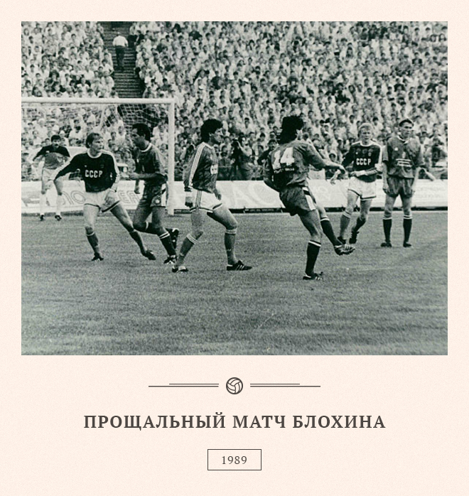Киев. Республиканский стадион. Прощальный матч Блохина. Сборная СССР против команды «Звёзды мира». На фото из советских игроков можно увидеть самого Олега Блохина (слева) и Олега Кузнецова. В том матче я защищал ворота сборной во втором тайме, первую половину встречи отыграл Виктор Чанов. Матч завершился со счётом 3:3. Мы с честью проводили настоящего короля футбола.