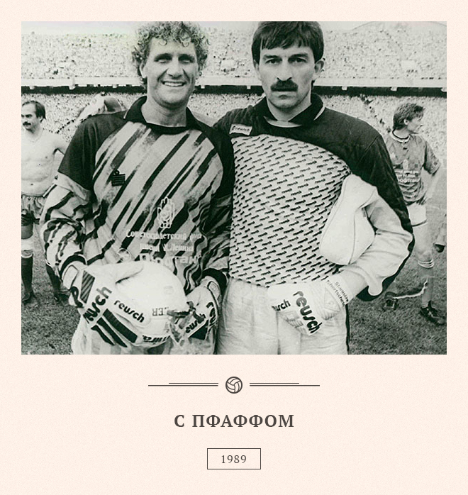 Прощальный матч Блохина. На фото рядом со мной стоит на тот момент один из лучших вратарей мира Жан-Мари Пфафф. Мне было чему у него поучиться.