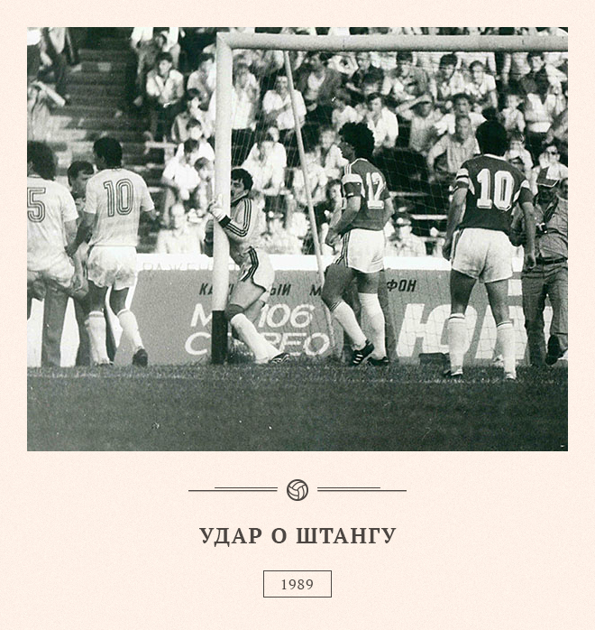 Днепропетровск. Стадион «Метеор». Чемпионат СССР. «Спартак» против «Днепра». В той встрече мы проиграли со счётом 0:1. На фото можно увидеть таких игроков, как Вадим Тищенко, Владимир Лютый, Виктор Пасулько, Фёдор Черенков. Я в этом моменте «влепился» в штангу.