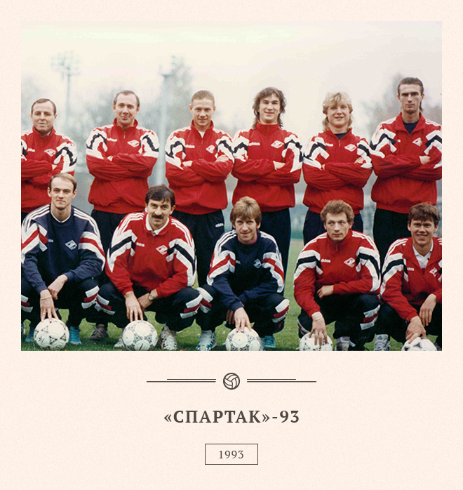 Тарасовка. На фото слева направо: тренер «Спартака» Александр Фёдорович Тарханов, главный тренер команды Олег Иванович Романцев, Карпин, Радченко, Бесчастных, Иванов (верхний ряд), Онопко, я, Пятницкий, Хлестов, Ледяхов (нижний ряд).