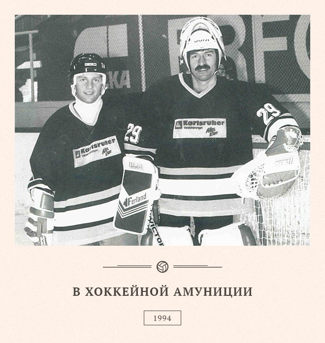 Дрезден. Фотография в хоккейной амуниции. На фото рядом со мной – словацкий нападающий дрезденского «Динамо» Марек Пенкса. Хоккейную амуницию нас попросили надеть для съемок рекламной кампании.
