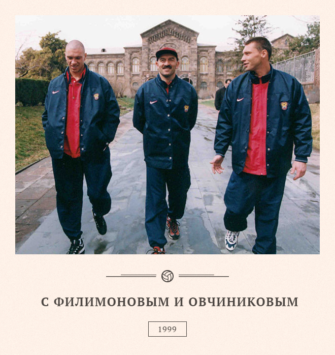 Ереван. Фото сделано перед отборочным матчем к чемпионату Европы — 2000, в котором встречались сборные России и Армении. Гуляю в компании вратарей российской команды Александра Филимонова (слева) и Сергея Овчинникова (справа). К слову, у армянской сборной мы выиграли со счётом 3:0.