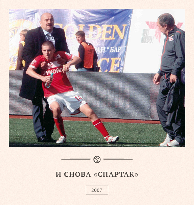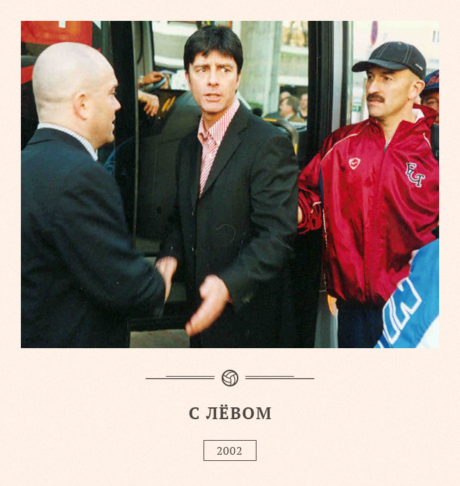 Стадион «Лужники». Период работы главным тренером в «Спартаке». Чемпионат России. «Спартак» против ЦСКА. На фото – с Дмитрием Торбинским. Тот матч запомнился тем, что мы на протяжении практически всей игры вели в счёте, но ЦСКА всё-таки смог на последней минуте встречи сравнять счёт усилиями Янчика. Ребята после игры упали в расстроенных чувствах, и я их начал потихонечку подбирать.