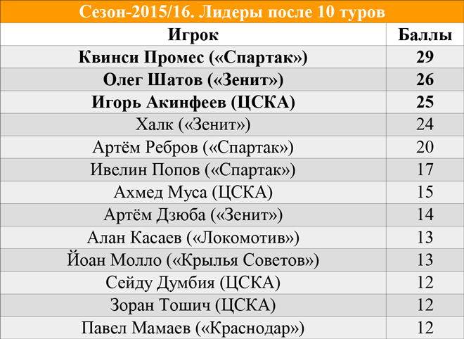 В списке лидеров сезона значительных изменений не произошло – разве что только Халк потеснил Артёма Реброва с четвёртого места. Тройку лучших по-прежнему возглавляет спартаковец Квинси Промес, второй – Олег Шатов, а третий – Игорь Акинфеев.