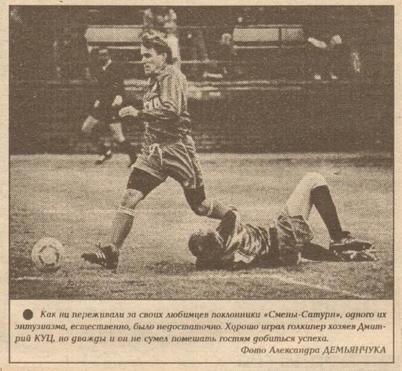 Также минимальным оказалось итоговое преимущество ЦСКА во встрече со «Сменой-Сатурн». Два слова о сопернике армейцев. Первая в городе на Неве частная футбольная команда родилась в ноябре прошлого года в результате альянса известной в стране футбольной школы «Смена» с малым индивидуальным предприятием «Сатурн», занимающимся выпуском фотообоев и оптовой куплей-продажей товаров народного потребления. Возглавляющий МИП «Сатурн» Леонид Шкебельский и его заместитель Андрей Митрофанов в детстве занимались в «Смене». Большими мастерами не стали,но любовь к футболу сохранили на всю жизнь. Вложив в нынешнем сезоне в свое детище 8 миллионов рублей (не государственных и не общественных, а своих кровных), владелец команды поставил перед ней две задачи: выйти в первую лигу и добиться права встретиться с ЦСКА. Эту часть программы действий на сезон «Смена-Сатурн» выполнила, сделав, казалось бы, невозможное. На предыдущей стадии розыгрыша Кубка питерцы обыграли в Калининграде «Балтику», крушившую на родном стадионе всех соперников. Хозяев не спас даже пенальти, назначенный незадолго до окончания встречи при счете 1:0 в пользу «Смены-Сатурн». Гостям удалось удержать минимальное преимущество и добиться права на встречу с последним чемпионом СССР.
