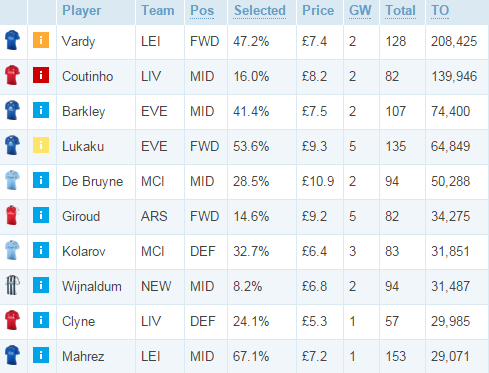Варди и Коутиньо перестали приносить очки и получили травмы — логичное лидерство в топе продаж этой недели. Парочка Баркли — Лукаку тоже попала в пятерку, причем по большей части из-за тяжелого календаря. Де Брюйне помолчал всего 2 тура, а уже попал в пятерку продаж. Достаточно неожиданно в список попал Жиру, набравший по 5 баллов в двух последних турах. Клиншиты стали редкостью для «Ман Сити», что отразилось на позициях Коларова. В нестабильного Вейналдума верит все меньше менеджеров. Атакующий потенциал Клайна в «Ливерпуле» не особенно ценят, что сказывается на эффективности игрока в fantasy. Замыкает десятку Рияд Марез, остающийся без результативных действий 3 матча подряд.