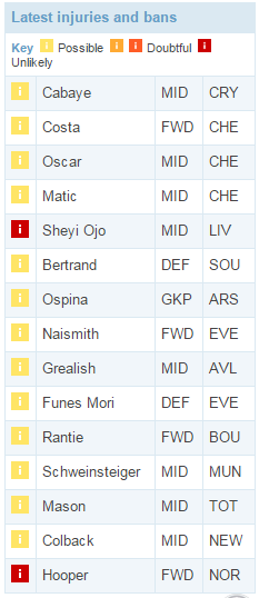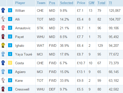 Виллиан продолжает удерживать звание лучшего игрока «Челси» в нынешнем сезоне и возглавляет топ покупок недели. Восстановившийся Димитри Пайе попал в пятерку. Суперстабильный Игало здесь же. Вспыхнувшие Арнаутович и Алли вообще попали в тройку — их цена будет продолжать расти. «Вест Хэм» набирает форму, и менеджеры вновь обращают внимание на Крессуэлла. Вернулись в элиту три звездных форварда Коста, Агуэро и Кейн. Здесь же Яя Туре, набравший 37 баллов за последние 5 туров.