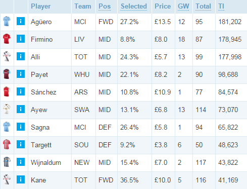Тройка самых покупаемых игроков весьма предсказуема: Агуэро в оптимальной форме обязан быть в любой команде, ощутивший доверие Клоппа Фирмино рвет и мечет, а дешевый Деле Алли слишком эффективен, чтобы его игнорировать. Восстановившиеся Пайе и Санчес продолжают покорять сердца менеджеров. Андре Айю тянет «Суонси» на себе в любых ситуациях. Самый стабильный защитник «Ман Сити» Санья частый гость в топе покупок. Здесь же Харри Кейн и Вейнладум, умеющие порадовать яркими выступлениями. Самая интересная фигура списка — защитник «Саутгемптона» Мэтт Таргетт, стоящий всего 3.8, но набравший 29 очков за последние 3 тура.