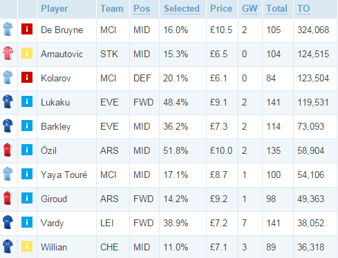Лидера продаж угадать было не сложно: травма де Брюйне не оставила менеджерам выбора. В тройке еще два травмированных — Коларов и Арнаутович. Некоторые менеджеры перестали верить в «Эвертон» и вывели в первую пятерку самых продаваемых игроков Лукаку и Баркли. Отсутствие ассистов отразилось на позициях Озила. Жиру, рано замененный в матче с «Челси», тоже тут. Менеджеры не особенно верят в Яя Туре и беспокоятся по поводу травмы Виллиана. В прошлом туре Варди наконец-то забил, но это не уберегло его от карательных мер со стороны 38 052 менеджеров.