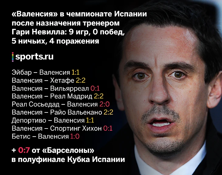 Валенсия с начала ноября не побеждала в лиге. Всего побед 5 и все пришлись на конец сентября - начало ноября. В ЛЧ они выступили бездарно. Да, Невилл не сделал чуда, но и хуже не стало. Вот если бы Невилл подбирал под себя состав, потом провёл подготовку и выступал так, тогда да. А так - много разговоров ни о чём.