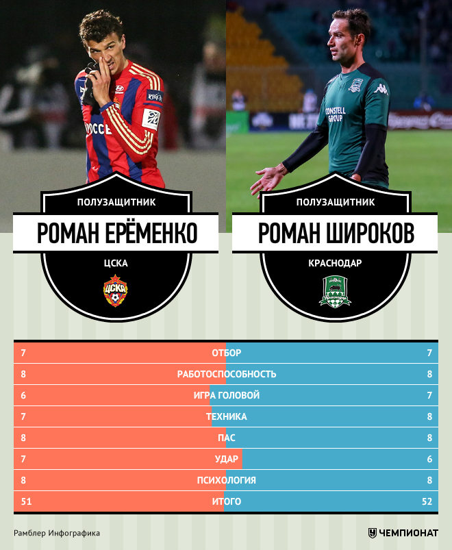 Если сравнить показатели Фрэнка Лэмпарда и Стивена Джеррарда за пять последних сезонов чемпионата Англии, они будут разительно отличаться только в графе «Забитые мячи», не самой главной для центрального полузащитника. Лэмпард и Джеррард сезон за сезоном шли по одним цифрам в точности передач, количестве ключевых пасов, ударов, единоборств и перехватов — неудивительно, что когда в сборной Англии на один звонок отвечали сразу два, пусть и высококлассных, оператора, начиналась путаница. У Ерёменко и Широкова ситуация немного иная. Они по разнице в возрасте ближе к тому, о чём помечтал Фил Невилл, и Широков, если задержится в ЦСКА чуть дольше, чем на полгода, почти наверняка станет играть глубже. Предпосылки для этого есть — шагая с Ерёменко в одни цифры по проценту выигранных единоборств, Широков чаще блокирует удары, пасы и навесы, а также удачнее играет на перехватах. В пользу такого варианта совмещения двух Романов говорит и чумовое умение Широкова моментально принимать решения, находясь в глубине поля. При примерно одинаковом проценте точности дальних передач путешествующий по лучшим клубам России полузащитник отдаёт больше острых передач, зоной назначения которых является штрафная соперника, играя глубже Ерёменко — 3,0 против 2,4 за матч. В этом — почти незаметный, но очень важный ресурс для усиления ЦСКА. Широков модернизирует полузащиту красно-синих умением проникать в штрафную — до сих пор игроки средней линии ЦСКА больше остальных в РФПЛ били издали. Это, в свою очередь, не лучшее умение новичка команды Слуцкого — за последние годы он не забил ударами из-за пределов штрафной ни разу.