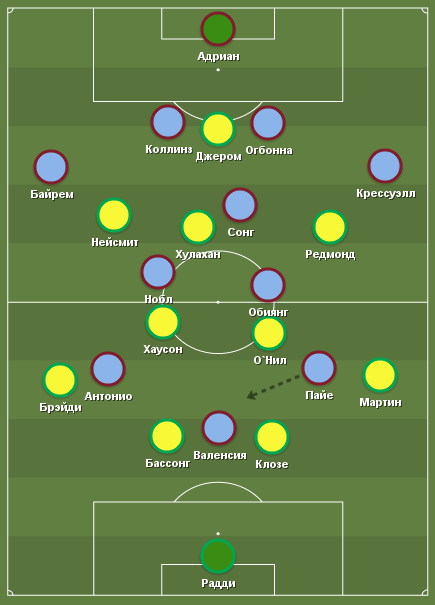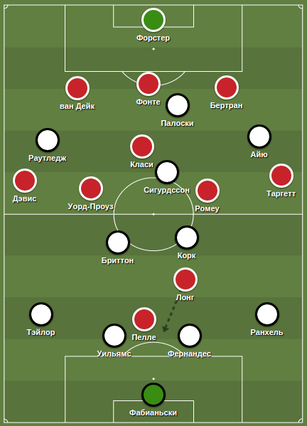 На этой картине Пелле и Лонг занимают места в центре нападения, а крайние защитники хозяев разрываются между необходимостью и закрывать фланги, и страховать партнеров в центре защиты. Корк и Бриттон не могут ни опуститься в оборону для помощи в опеке нападающих, ни отойти на фланг – тут же открываются дыры в центре поля, и в эти дыры лезут Ромеу и Уорд-Прауз. Логичным итогом этой художественной вакханалии стал гол Лонга. Перевод с фланга на фланг, защита оказывается растянута. Идет подача, Натон не поджимает центральных защитников, Фернандес не берет игрока за спиной Уильямса, а держит того, кто повыше, в итоге Лонг остается совсем один на линии вратарской. Довести игру до победы по такой игре для гостей не составило труда. «Суонси» так и не создал ничего у ворот Форстера, и Гвидолину предстоит серьезно подумать над повторением эксперимента с игрой флангами.